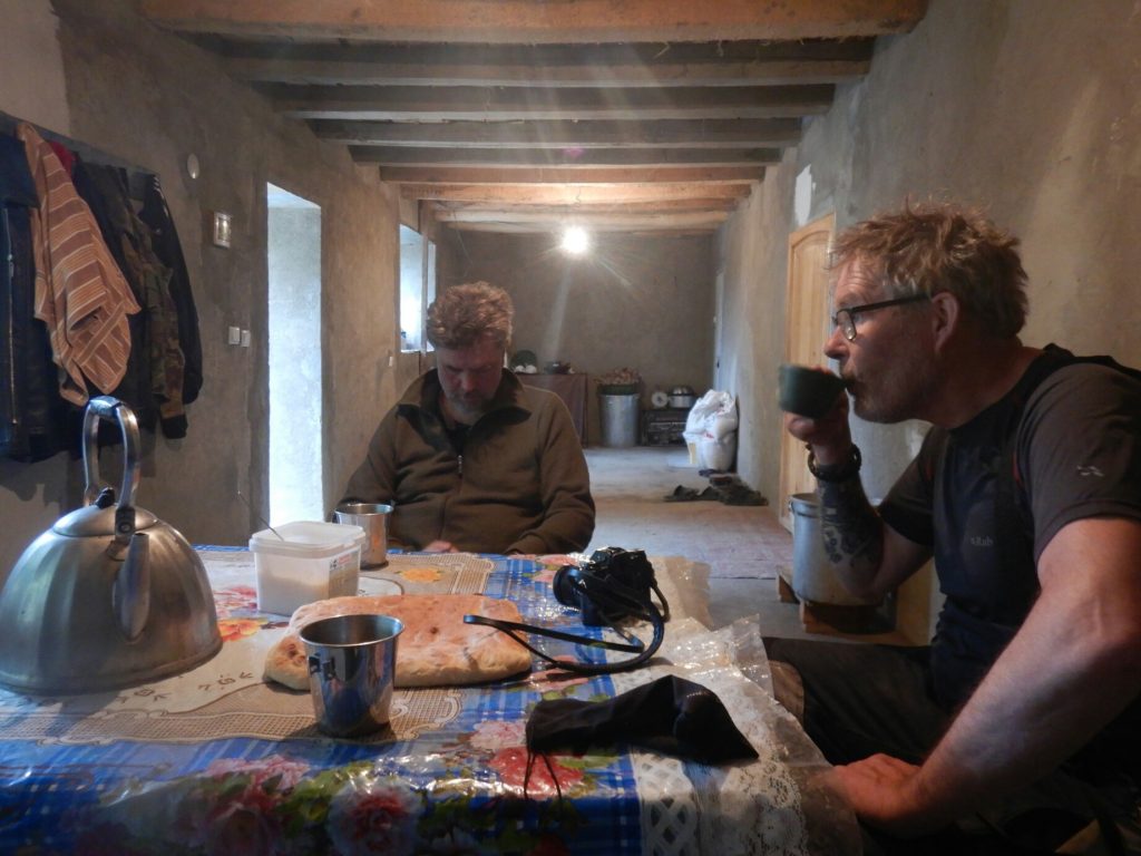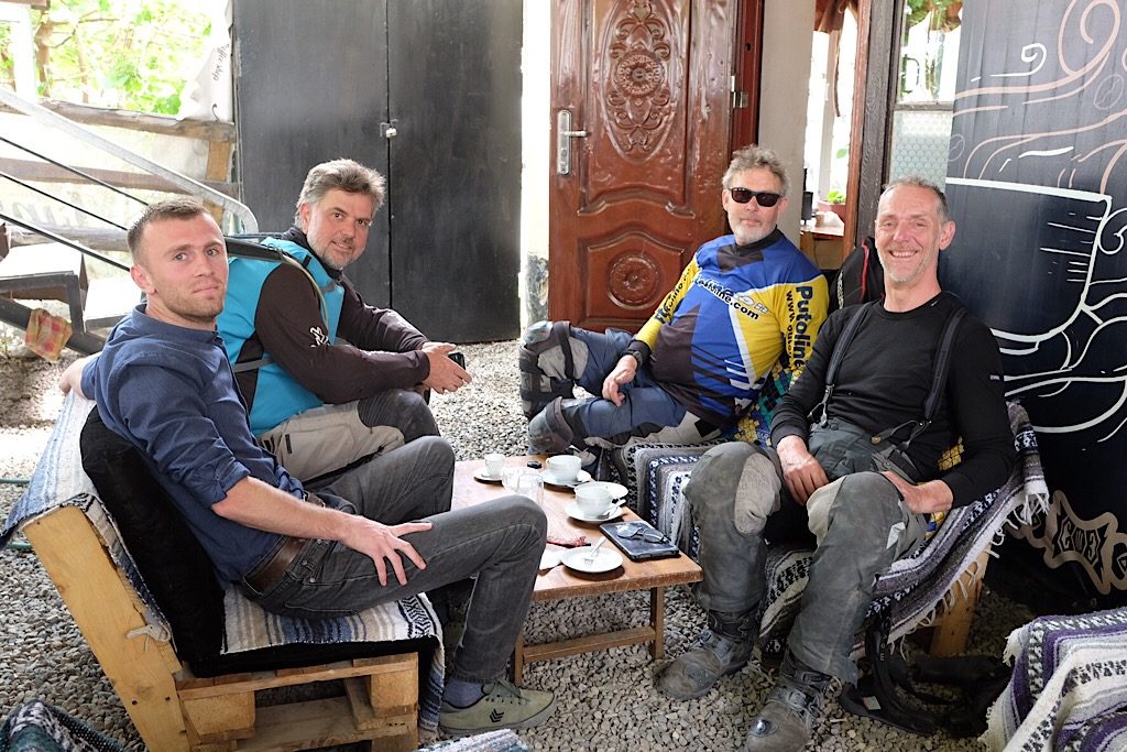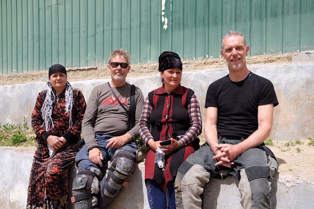 De man is een beetje teleurgesteld, de klus is immers nog niet helemaal klaar. Marco en Erik besluiten dat het wel genoeg is. We willen de man wat geld geven maar daar wil hij niet van weten. We leggen het geld op zijn werkbank; de man heeft immers een uur flink bezig geweest en heeft wat van zijn gereedschap vermaakt om ons te helpen. Min of meer boos accepteert hij het geld maar holt meteen zijn shop in. Hij komt terug met een stift: “Mag hij dan zijn naam op de motor schrijven?” Dat mag uiteraard. Marco voelt zich zeer vereerd. Misha – Bishkek – en zijn mobiele nummer voor de whatsapp.