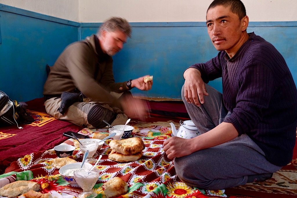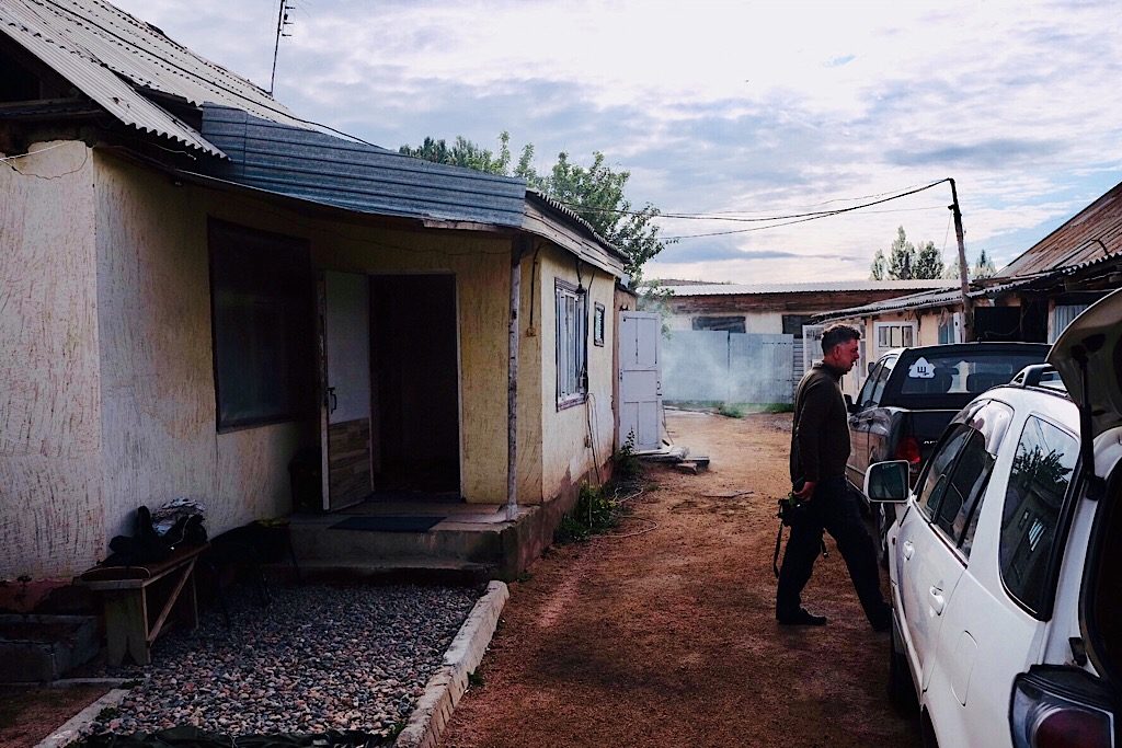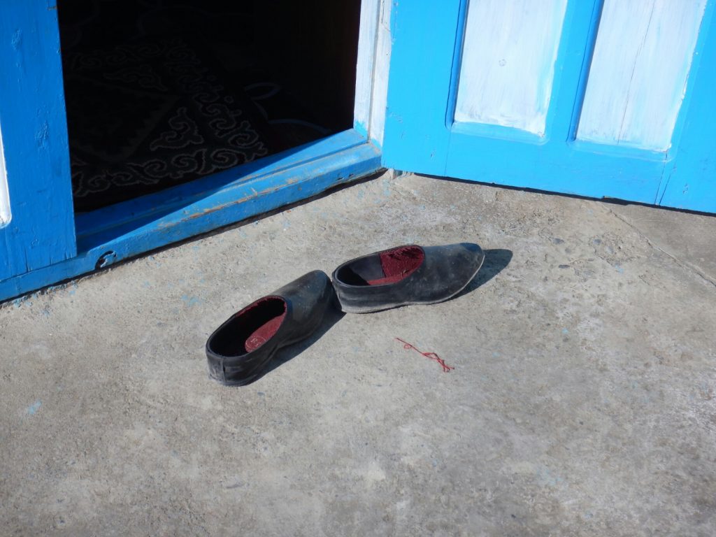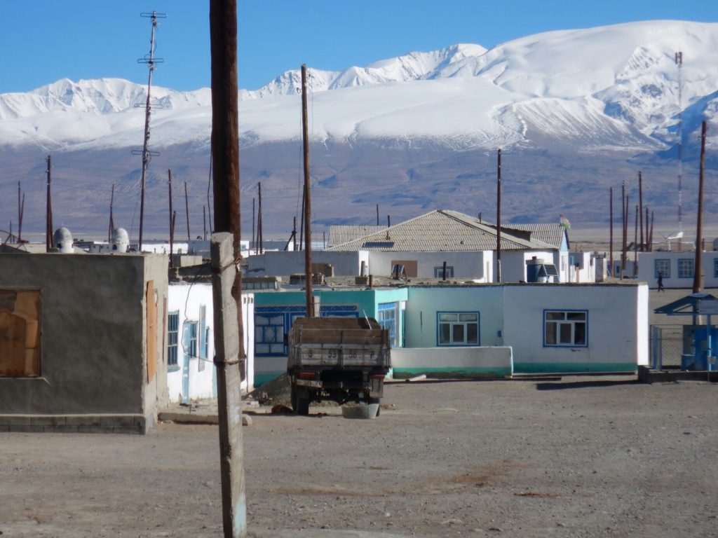 Bij Cholpon-Ata ligt een mooie kloof naar de bergen richting Kazachstan We duiken de kloof in en komen bij een … schlagbaum. Jawel. Er zitten een dame en een heer bij de Schlagbaum. De man komt op ons afgestoven met op zijn arm: een roofvogel. Het is een flinke adelaar (?). Of we met dit prachtige exemplaar op de foto willen.