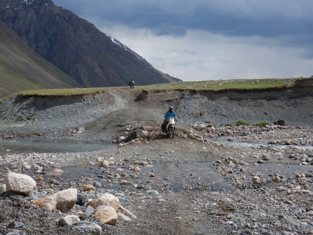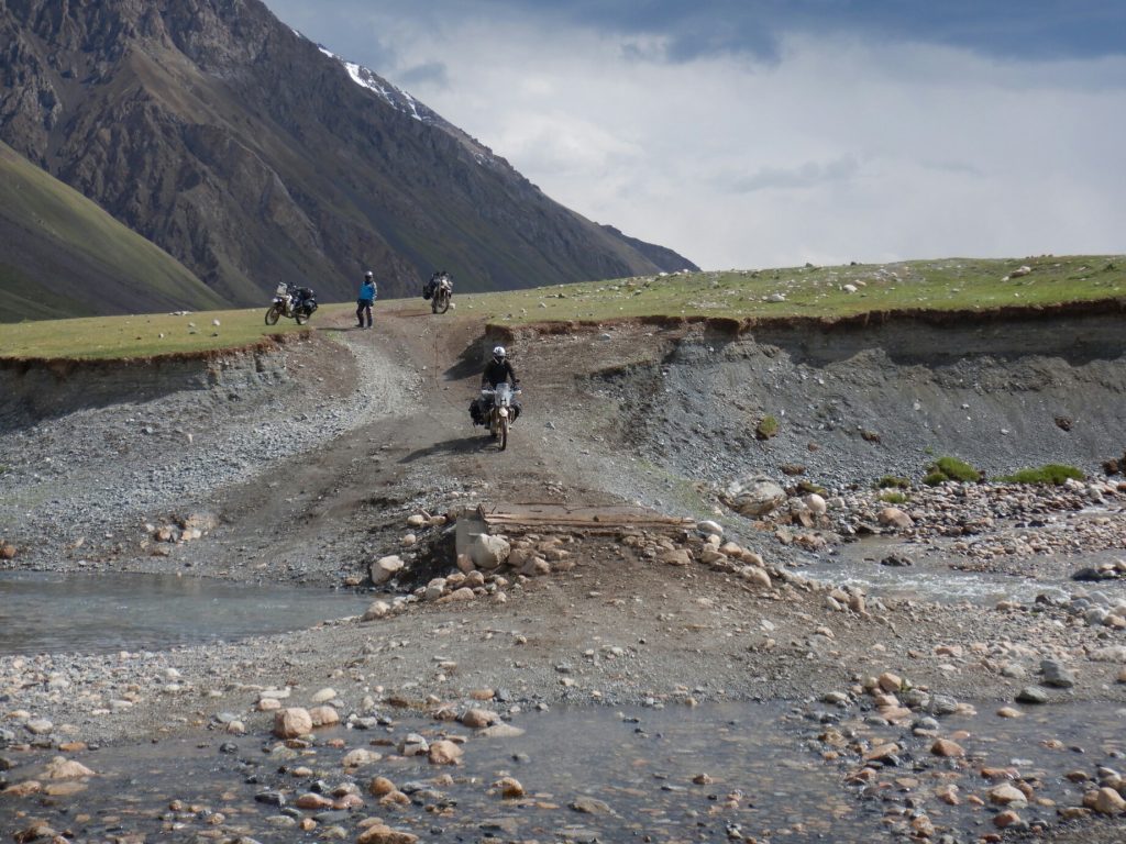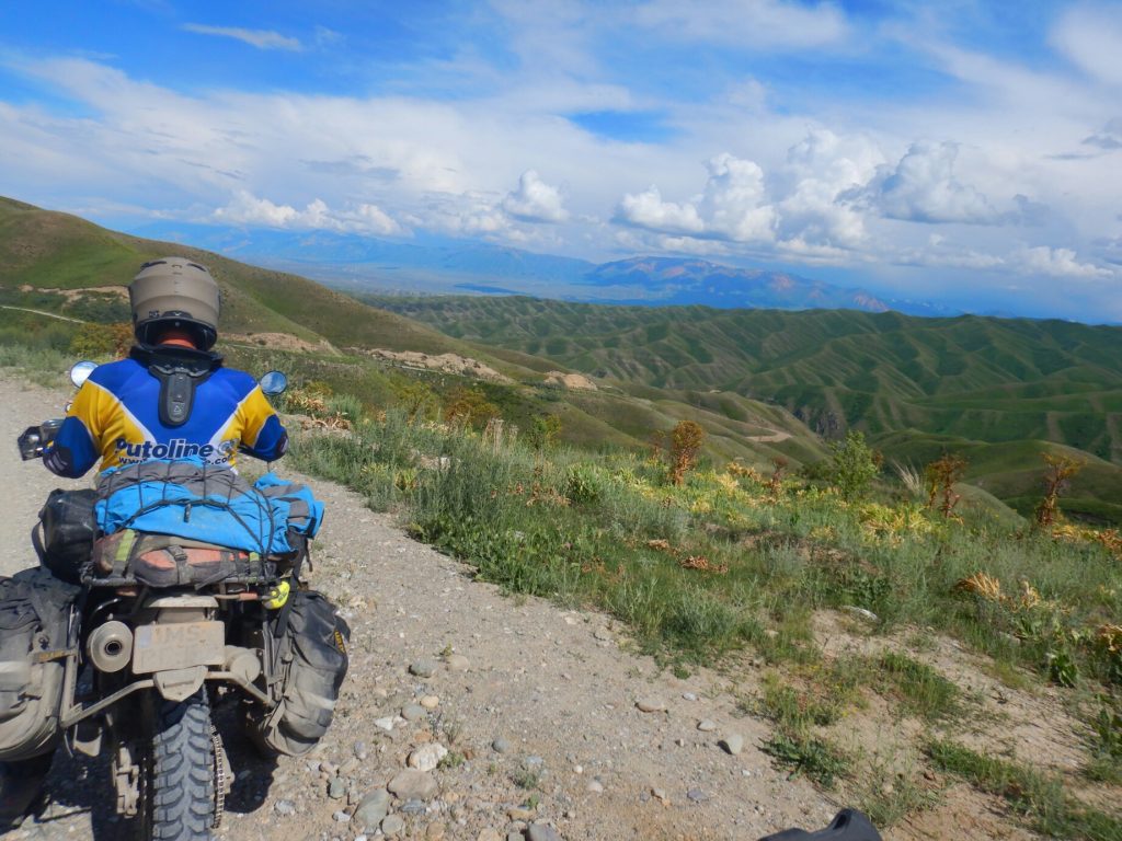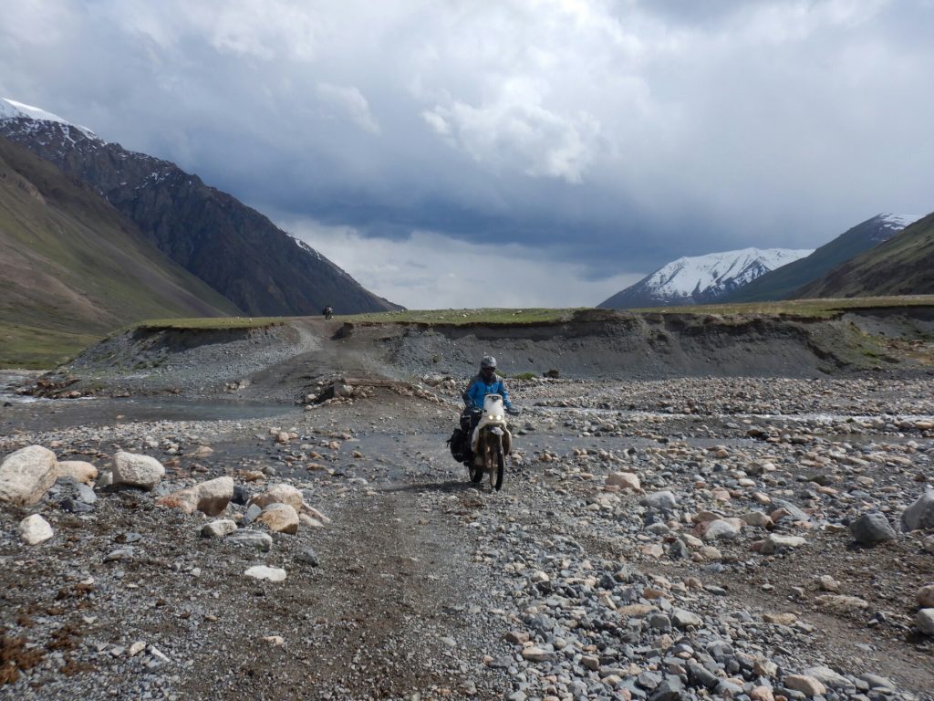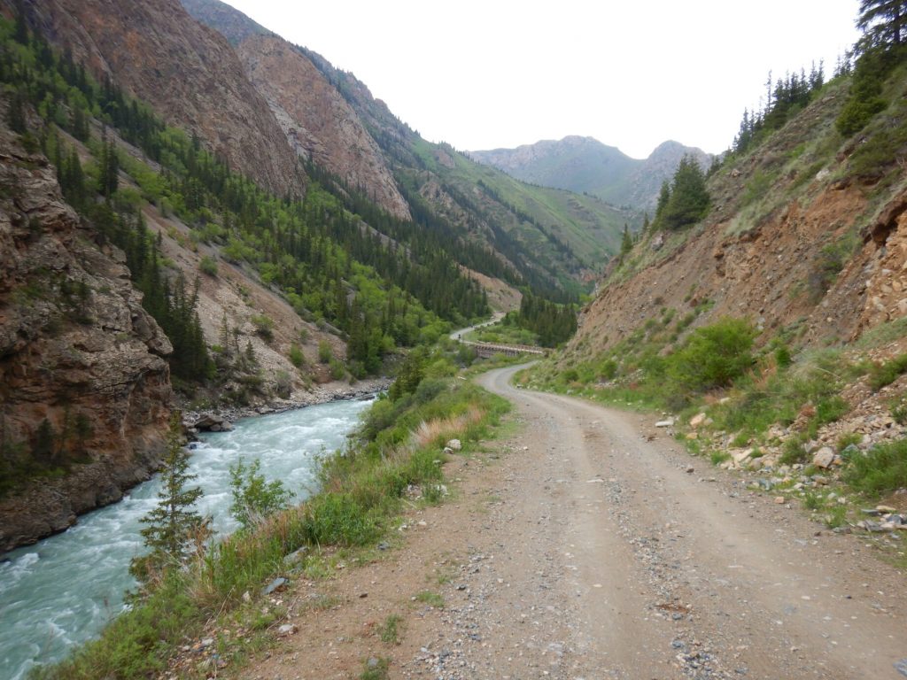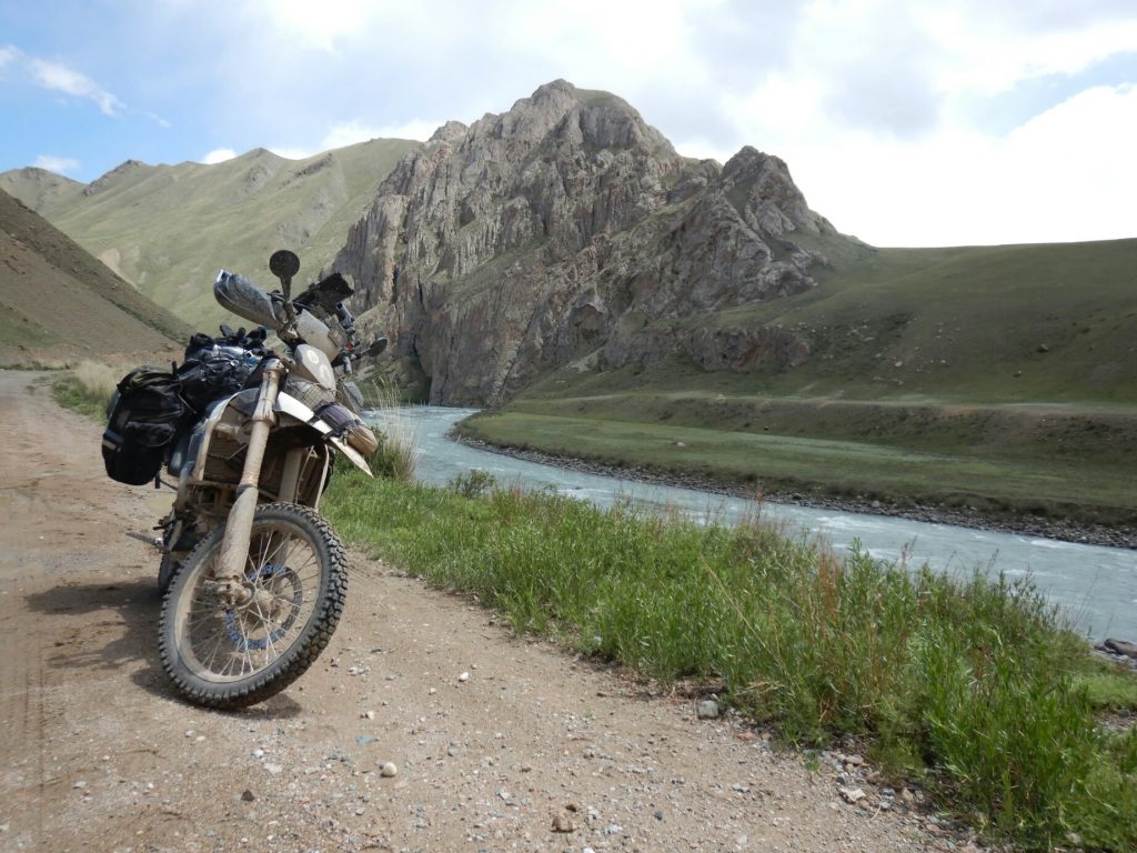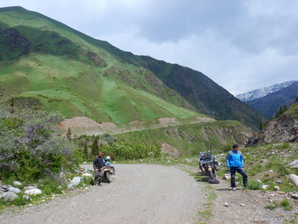 Daar bepakken we de motoren, doen de motorkleding aan en vertrekken. De bedoeling is de tocht te vervolgen langs Issy Kul, maar dan langs de noordkant. En waar we denken dat het leuk is, duiken we een kloof in. Daarbij baseren we ons op de vertrouwde hulpmiddelen:open street map, I-Overlander en de normale landkaart.