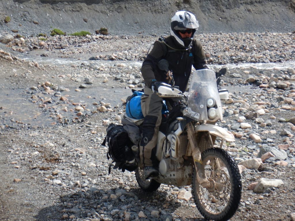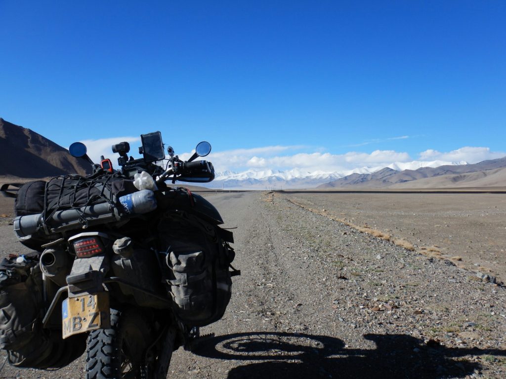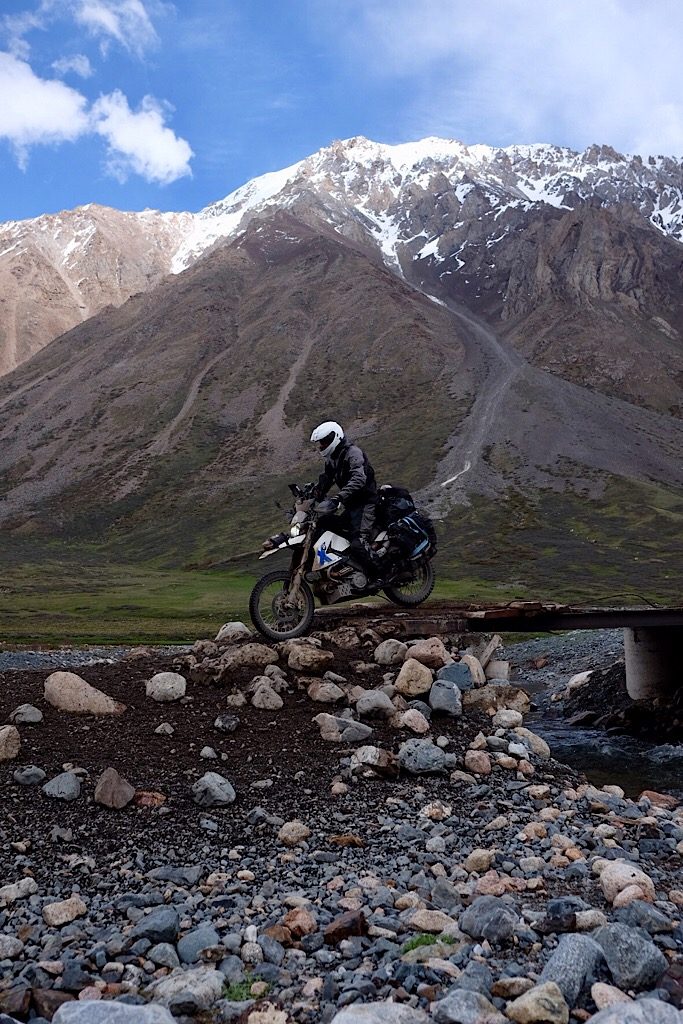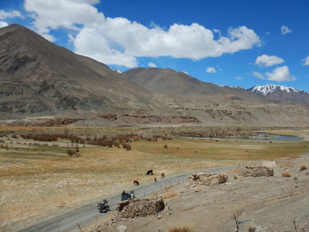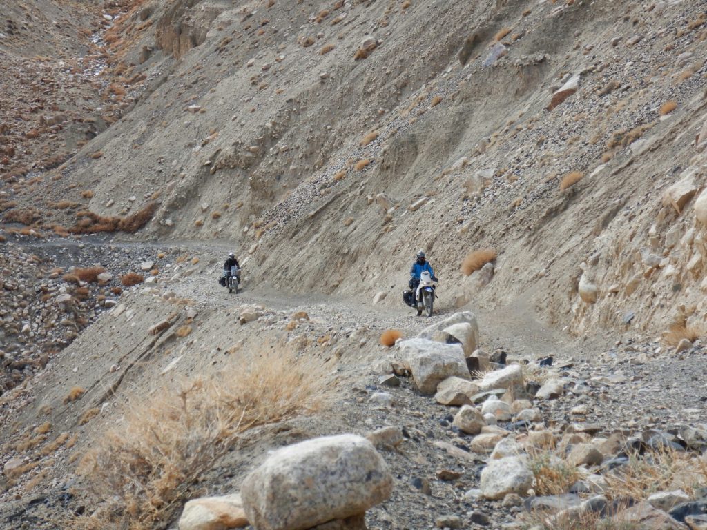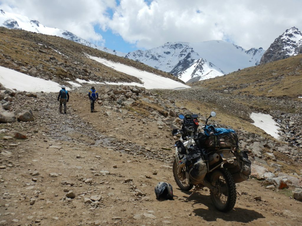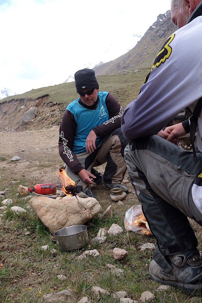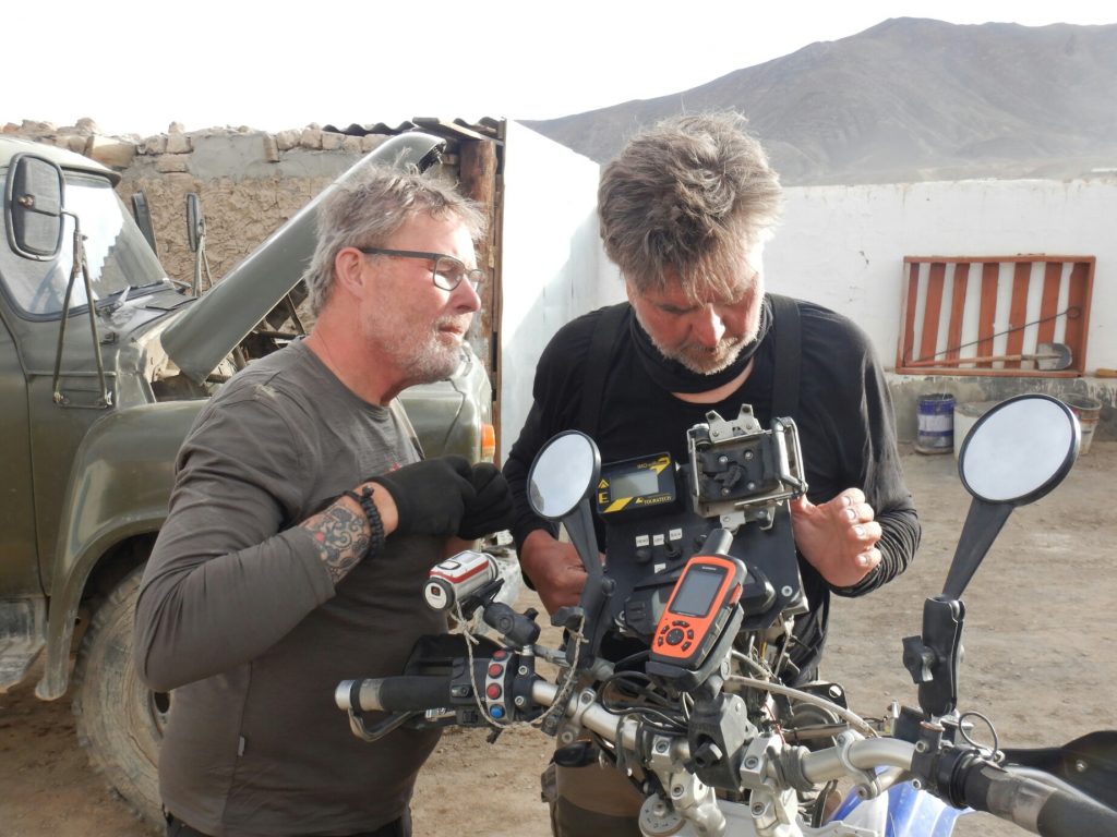Daar bepakken we de motoren, doen de motorkleding aan en vertrekken. De bedoeling is de tocht te vervolgen langs Issy Kul, maar dan langs de noordkant. En waar we denken dat het leuk is, duiken we een kloof in. Daarbij baseren we ons op de vertrouwde hulpmiddelen:open street map, I-Overlander en de normale landkaart.
