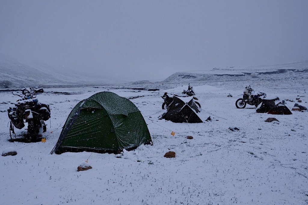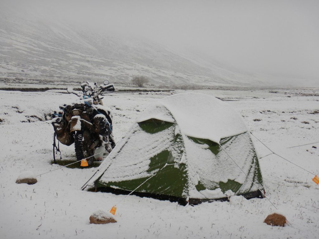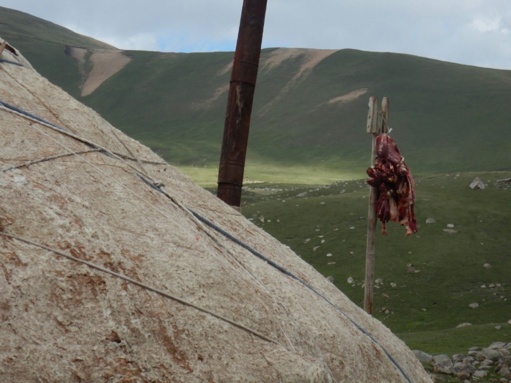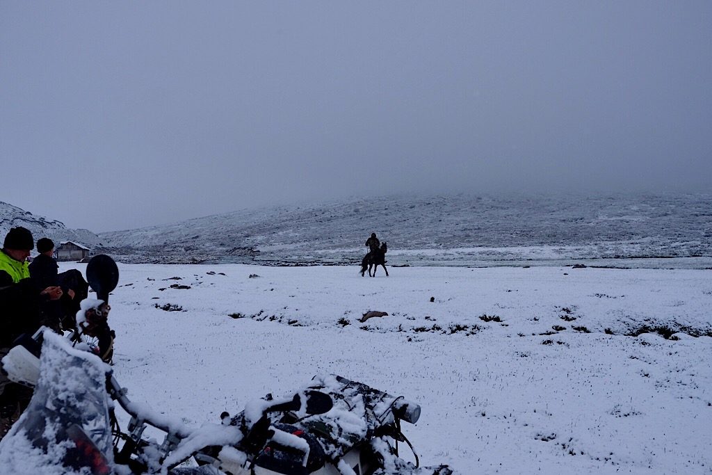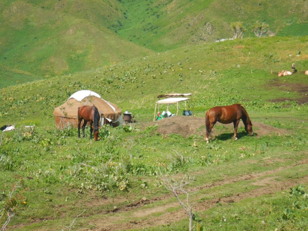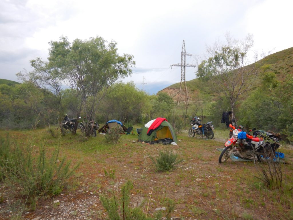 We zijn echter niet de enigen dat vinden. Elk stukje waar iets kan staan, is bezet. Met auto’s, tenten, yurts, barbecues, paarden, verhuur van paarden, afval. Van de schoonheid blijft niet veel over dan een rommelig en vervuild geheel. We rijden langzaam door de kloof om de dieren niet teveel te laten schrikken van onze motoren. Op het pad rijden ook jongeren op de huurpaarden. Dat matcht niet met onze rijstijl. Waar wij altijd zoveel mogelijk ruimte laten tussen ons en de paarden, rijden de jongeren midden op de weg en blijven daar. Of komen met het paard onze kant op. Gezien de onervarenheid van de berijders is het onduidelijk of het paard gewoon z’n dagelijkse gangetje sjokt, of dat de jongeren proberen met het paard bij ons te komen. Vervelend.