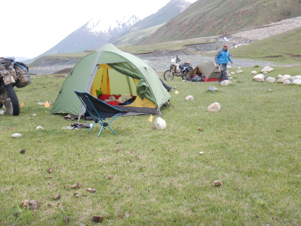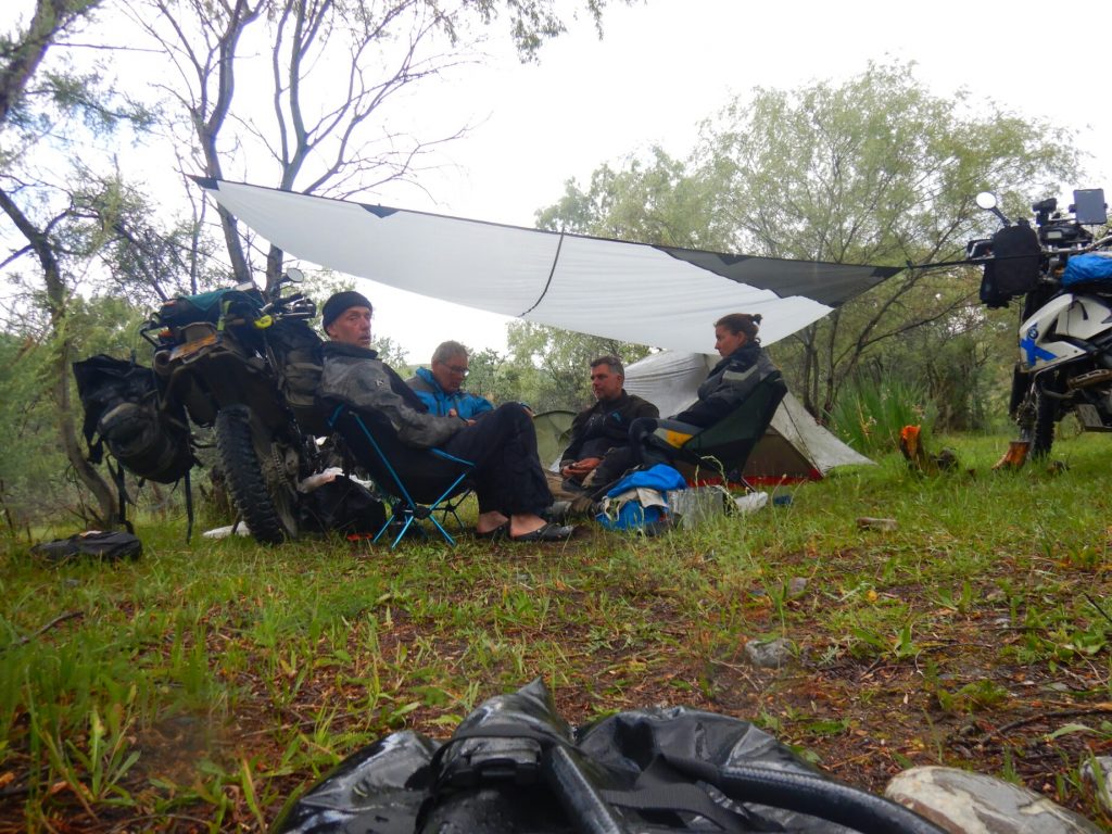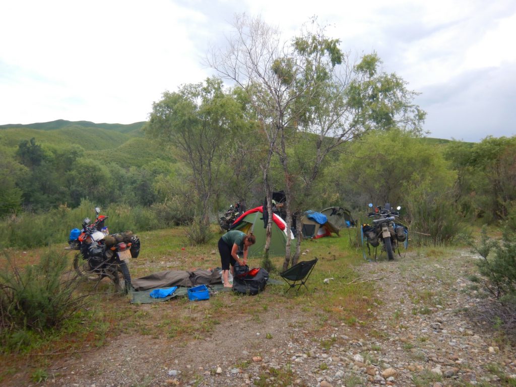 Uiteindelijk zit het mee; we vinden een mooie vlakte. Beschut met struiken en bomen. En geen andere mensen te zien. En geen rotzooi. Zo snel als we kunnen zetten we de tenten op en maken die klaar voor de nacht. We zijn nog bezig als de eerste regen valt. de tentjes in en rustig wachten wat er gebeurt. Het zit mee; de regen is mild en van zeer korte duur. We komen de tentjes weer uit, zetten de tarp op. Zo kunnen we droog koken mocht het weer gaan regenen.