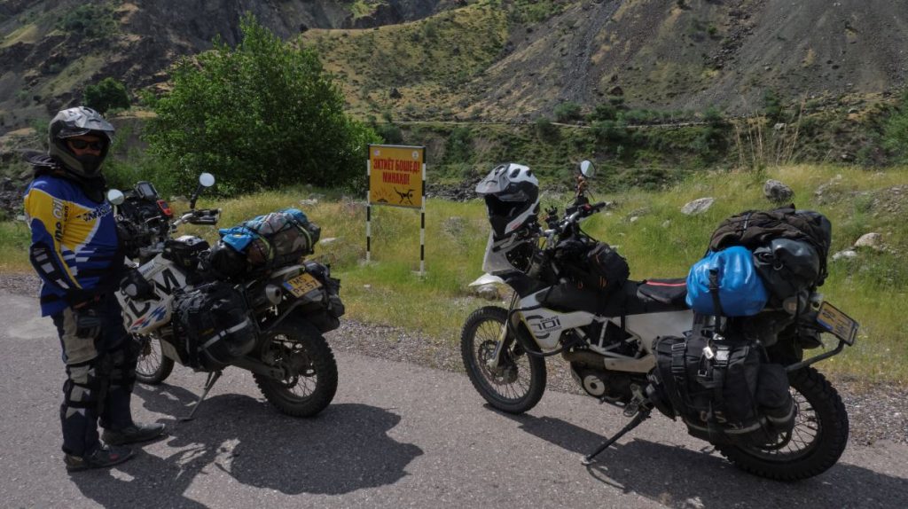 We komen eigenlijk alleen nog maar herders met kleine kuddes tegen. Het wordt ook steeds kouder. We vertrekken met 14 graden en nu is het nog maar 5 graden. We rijden ook de mist en het miezert zacht. Opeens rijden we op een klein plateau waar het wemelt van de koeien, schapen, geiten en herders [m/v]. En honden. Voor deze honden zijn we nog steeds een rariteit. De honden zijn gewend de kudde te beschermen tegen alle dreiging, en drie Hollanders op motoren zijn dat blijkbaar ook. Veel honden vallen agressief uit; wij leren ermee omgaan. In het begin van de reis schrokken we ons een ongeluk als er een hond achter ons aankwam. Nu weten we dat de honden gewoon hun taak doen en vooral: dat ze niet aanvallen. Ook deze forse honden komen agressief op ons af. Vaak duiken ze naar de achterkant van de motor. Als je gas geeft, denderen ze achter je aan. Als je geen gas geeft: ook. In beide gevallen zetten de honden de aanval niet door. Tot nu toe.