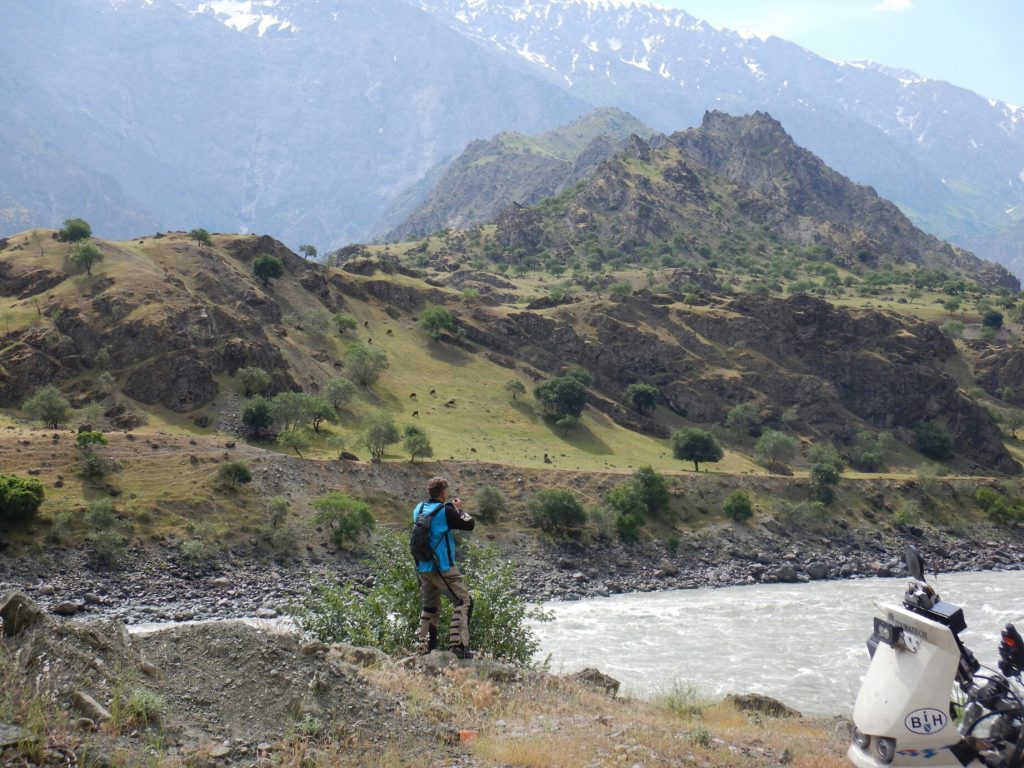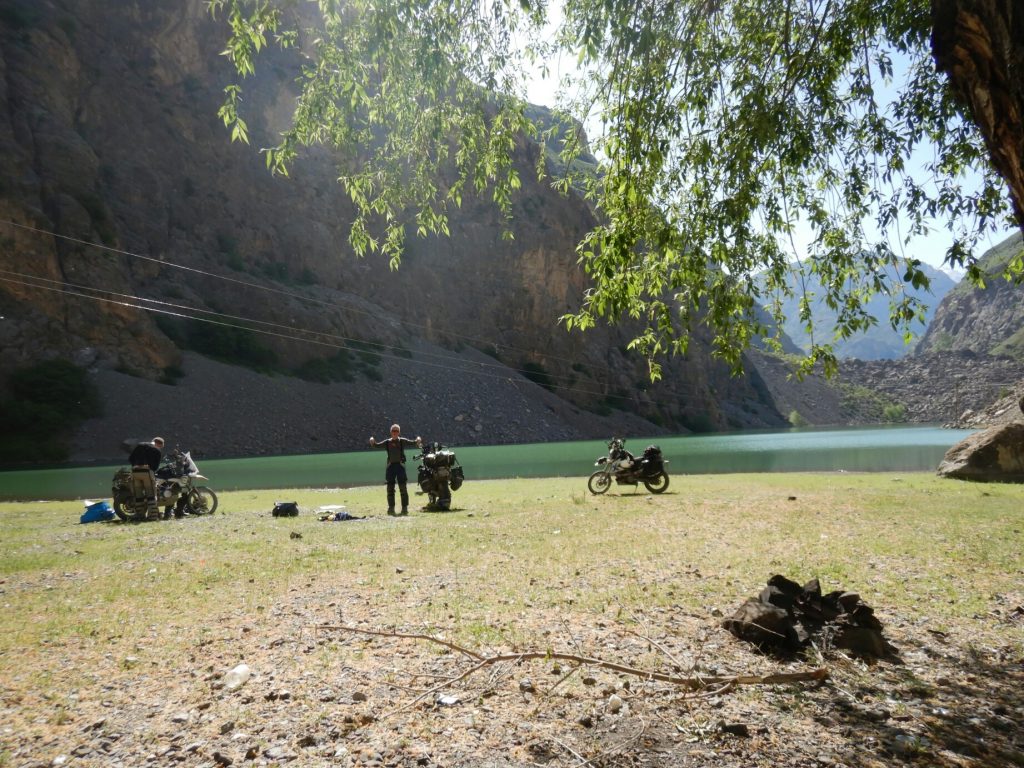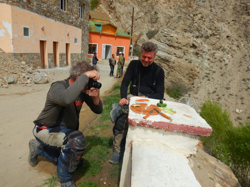 Totdat rond 16u een van de gidsen met een hengeltje vertrekt. Hij gaat even vissen in de grensrivier. Hij komt terug met drie prachtige vissen en maakt ze schoon. De vissen gaan de pan in en worden tot een heerlijke vissoep bereid. Vervolgens ziet de gids ook nog wat Marco Polo schapen lopen. Hij pakt zijn kijkers en zet de kijker met statief zo, dat het schaap recht in de lens te zien is. Een prachtig dier dat rank en elegant over de rotsen loopt. Naast het Marco Polo schaap zien we ook nog enkele bergmarmotten. Ze zijn van het formaat Alpenmarmot, maar hebben een veel dikkere bontjas aan. Zand/goudkleurig, prachtige beestjes.