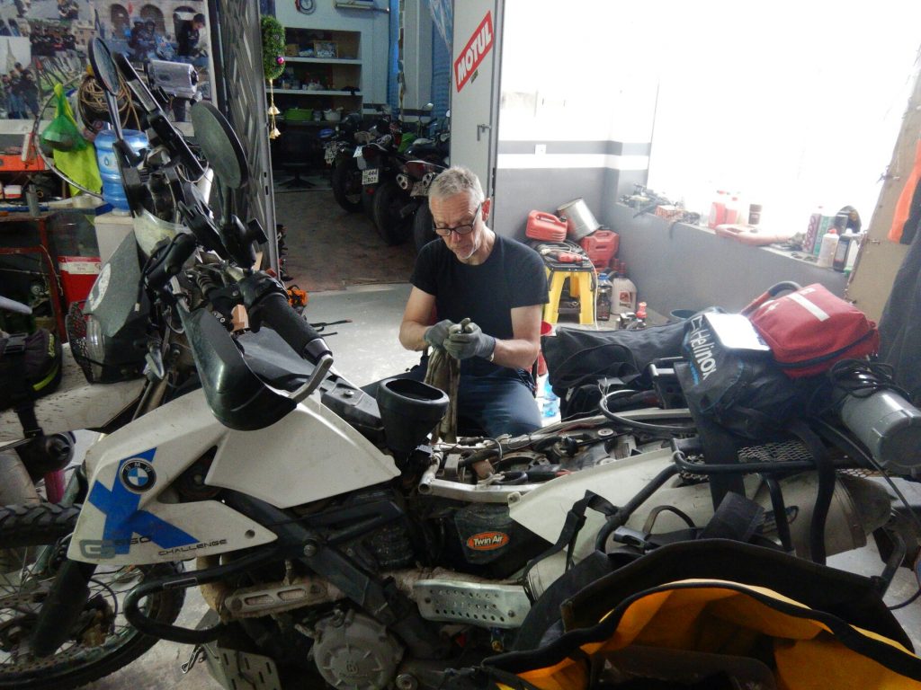 Marco hoeft alleen zijn achtertankje te vullen. Daar gaat max 9 liter in. Maar Marco schat in dat er nog wel 2l in de tank zit. We zijn getuige van een wonder: er gaat precies 10l in het tankje. Wauw, hier werkt de natuurkunde toch anders dan in het Westen.