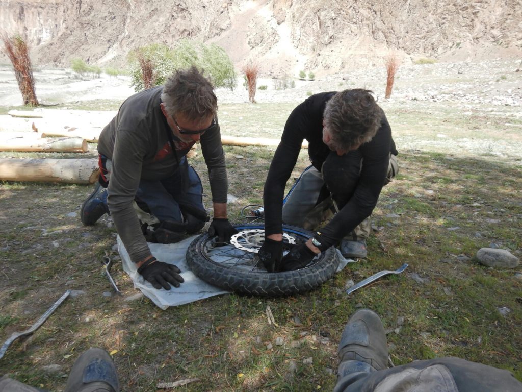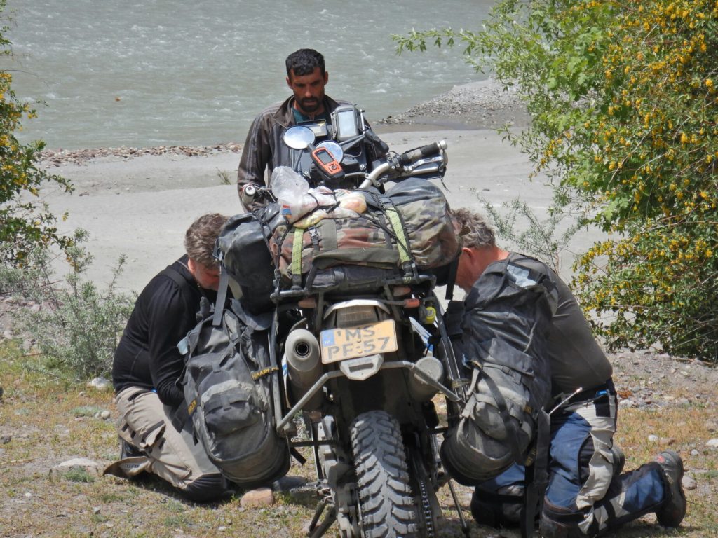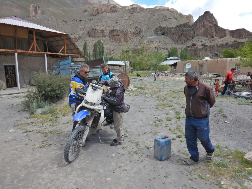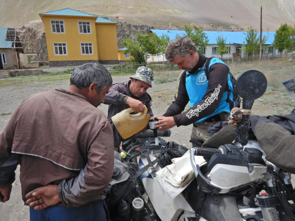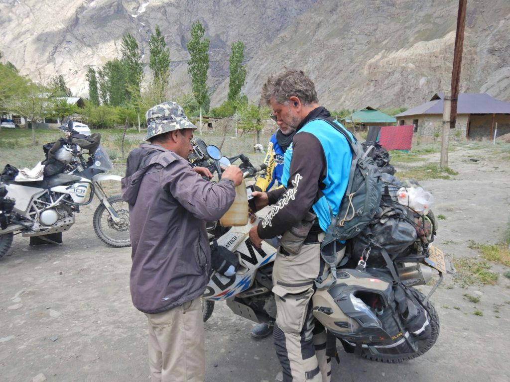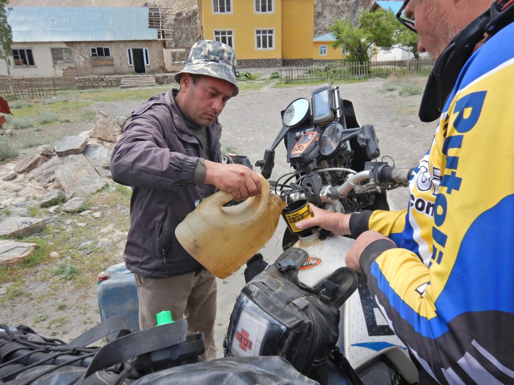 We rekenen af, pakken de motoren en rijden vanuit Langdar een paar kilometer terug richting Zong. Daar zouden we weer kunnen tanken bij tankstation Zong. Schijnt een vierkant huisje te zijn waarop Gas 3AC staat. We treffen het gebouwtje aan op de plek waar we het verwachten. En al snel komen er wat mensen naar ons toe. Prijs per liter wordt afgesproken en er wordt getankt. Vanuit een oliedrum gaat de bezine in een 20l jerryacan om dan te worden overgeschonken in een soort 10l emmer. Weer een zeer bijzondere ervaring. We filteren de brandstof wel.