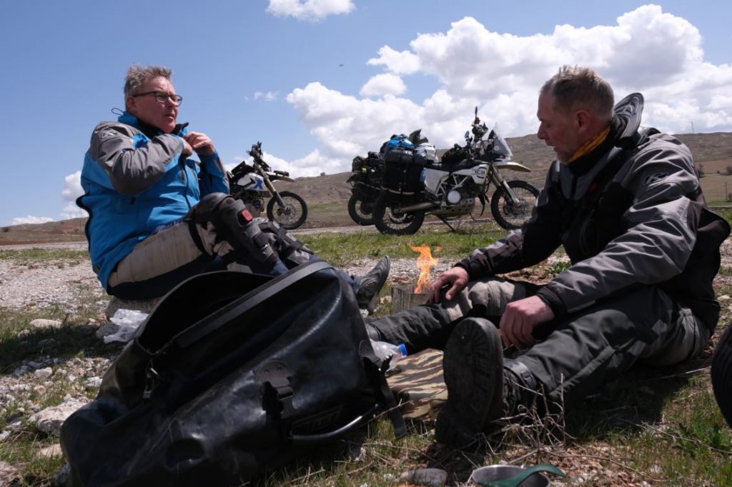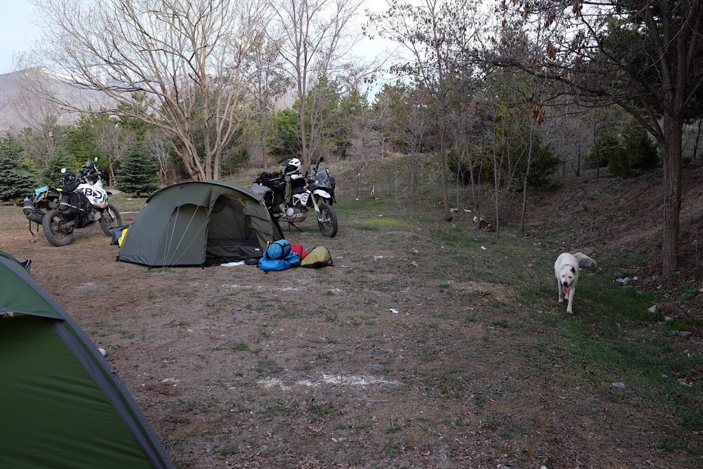 14 April, ‘s Morgens worden we wakker terwijl het al licht is. Dat is mooi; geen gekke dingen gebeurd vannacht. We leven nog. We staan op en onze waakhond ligt nog netjes op haar plek. Dat ziet er goed uit. We zetten wat water op voor de koffie en beginnen met het ochtendritueel: opfrissen, inpakken, ontbijten, reiskleding aan, motoren reisklaar maken en dan weg.