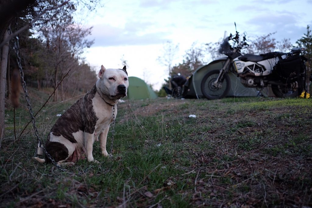 Geruststellend is dat we in eerste instantie zien dat hij nog steeds aan een ketting van ruim twee meter zit. Alleen … die ketting zit nergens meer aan vast. Hij is blijkbaar losgebroken. Een grote vechthond die zichzelf los werkt van een ketting. Van koffie zetten en opruimen komt helemaal niets meer. D’r loopt gewoon een retesterke vechthond rond onze tenten. Nadert in cirkels die steeds kleiner worden. De termen Nee, Af, Braaf, Weg, en wat dan ook allemaal in het Nederlands, Turks, Armeens en Peruaans naar de hond geroepen. Noppes, beest komt angstaanjagend rustig steeds dichter bij. Onze waakhond, een teefje, ligt heerlijk te rollen in het gras en draait nog eens wat met haar achterste. Die heeft blijkbaar andere plannen dan een beetje onze waakhond uit te hangen.