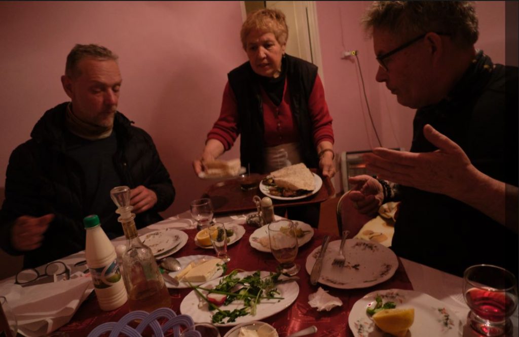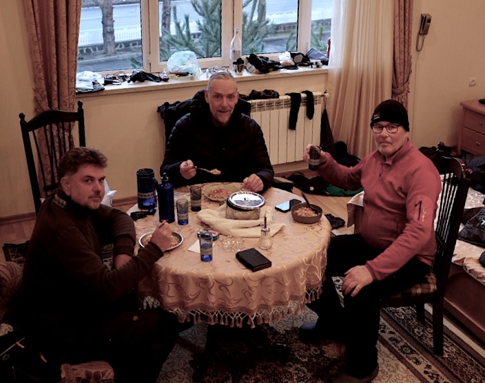 Gelukkig is er een Poolse gast die ons over de taalbarriere helpt. De gastheer en gastvrouw spreken Russisch….. Dan aan tafel waar we kippensoep, geroosterde aubergines, prei, gebakken aardappelen, rundvlees en kip aangeboden krijgen. Samen met twee Russische gasten genieten we van al dat heerlijks met dito wijn. Een uurtje later rollen we met volle buik en gelaafd aan de alcohol van tafel.