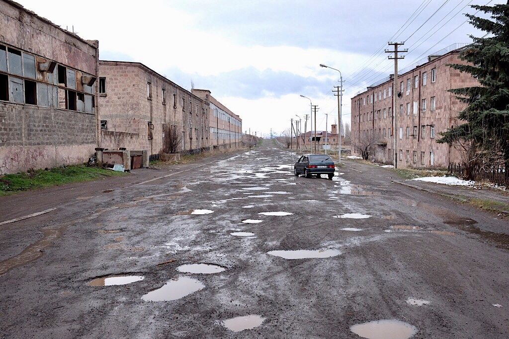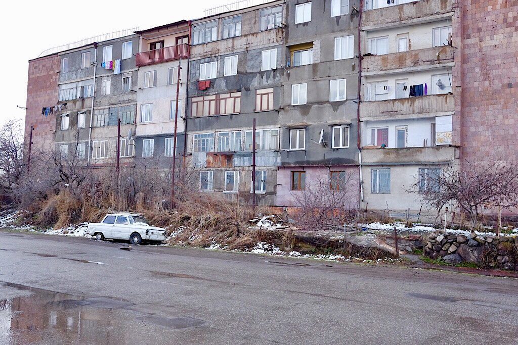 Rond drie uur wandelen we een kwartiertje naar het centrum van Sevan. Inmiddels is het even droog. Zo lopend hebben we tijd om de omstandigheden eens goed in ons op te nemen. Het is een grauwe sfeer. De bouwstijl is Russisch, grijs, haveloos en sfeerloos. Slecht onderhouden flats die nagenoeg tegen elkaar zijn gebouwd. We lopen door een straat vol gaten waar de laverende Zastava’s en Lada’s passeren. Toch spotten we ook een Porsche Cayenne en een Bentley. Uiteraard zijn deze nieuwe en moderne bakken een uitzondering, maar toch.