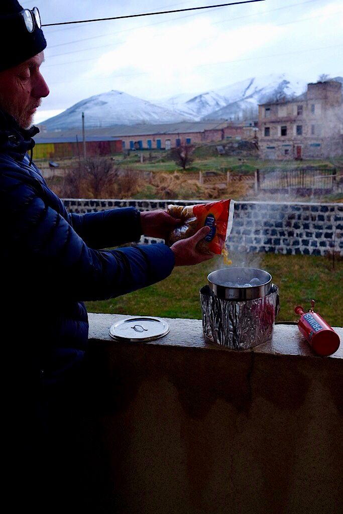 We koken onze eigen avondmaal, dat we al een paar dagen meeslepen. De pot bestaat uit pasta met tonijnsaus. Eigen receptuur waar Joop Braakhekke nog een puntje aan kan zuigen. We koken op de galerij en kunnen binnen no-time in onze eigen kamer aan tafel. Glas wodka erbij en een kop koffie na. Mens wat kun je met weinig blij zijn.