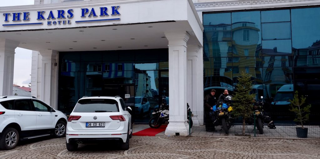 Eenmaal in Kars wordt het moeilijk om een overnachtingsplek te vinden. Er zijn geen campings en wild kamperen is niet te doen. Kars ligt op een brede vlakte waar het heel hard waait, het guur en koud is, de zon al snel daalt en het eigenlijk heel onaangenaam is. Dan maar de stad in. Een rommelige stad. Zeer stoffig. Druk verkeer en heel veel voetgangers die zich allemaal tegelijkertijd een andere richting in willen wurmen. De hotels die wij vinden hebben wel een parkeerplaats. Op straat. Dat willen we niet. Na lang zoeken een hotel gevonden waar de motoren veilig geparkeerd kunnen worden. Op straat (zucht).