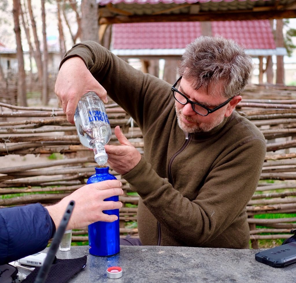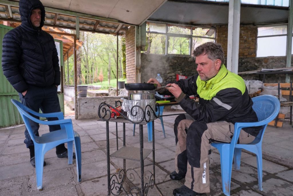 Uiteindelijk eindigen we ‘s avonds net buiten het plaatsje Khertvisi. Een voormalige profbokser ontvangt ons hartelijk op zijn kampeerterrein. Gezellig gegeten, na afloop nog een lokale vodka (een acquired taste, zullen we maar zeggen) maar we slapen er goed op. Tijdstip tukkie doen is een beetje onduidelijk omdat we weer een uurtje zijn opgeschoven in de tijd. Het zal iets tussen 21 en 22 uur zijn geweest.