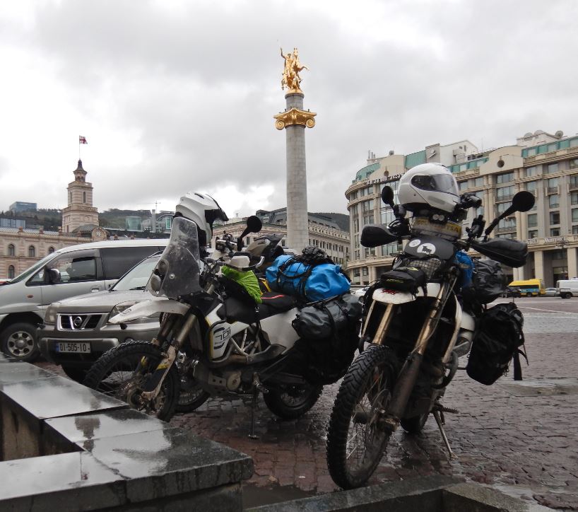 Na dik een uur zijn we door de stinkende stad met walmende diesels heen gereden. Eerst ontbijten we even in een restaurant en daarna de delaer opzoeken. Erik wilde graag een nieuwe zijstandaard en Marco wil eindelijk een waterdichte regenbroek. Bij elke regenbui is zijn motorbroek binnen 5 minuten nat en na 10 minuten doorweekt voor de rest van de dag. De dealer kan ons niet helpen. Helaas. Dan maar door naar de grens met Azerbeidjan, het doel van deze dag. De stedelijke rijstijl wordt op de rijks- en provinciale wegen doorgezet. Op de een of andere manier lijken automobilisten verplicht zoveel mogelijk voertuigen in te halen. Wij worden ingehaald door auto’s die 200m na het inhalen van de weg af gaan en parkeren bij een winkel. So be it. We denken nu dat het monumentale beeld bij Tiblisi meer bedoeld is als een soort van aflaat teegn het rijgedrag. Voor ons betekent het dat we altijd achter een bus of vrachtwagen blijven hangen, zodat we altijd een stevig schild voor ons hebben dat de klappen kan opvangen.