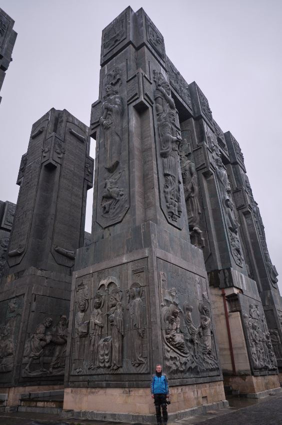 19 April, Vanuit het hotel vertrekken we naar een uitzichtspunt aan het meer van Tiblisi: The Chronicle of Georgia. Megalomaan is een woord dat dit monument geen recht doet. Het monument toont de historie van Georgie in brute Sovjet-architectuur. Zuilen van 30 meter hoog tonen in dikke bronzen platen de voorstellingen van Georgische koningen en beelden van gelijkenissen uit de Bijbel. Wij lezen dat die bijbelse voorstellingen bedoeld zijn de verspreiding van het Christendom te verbeelden.
