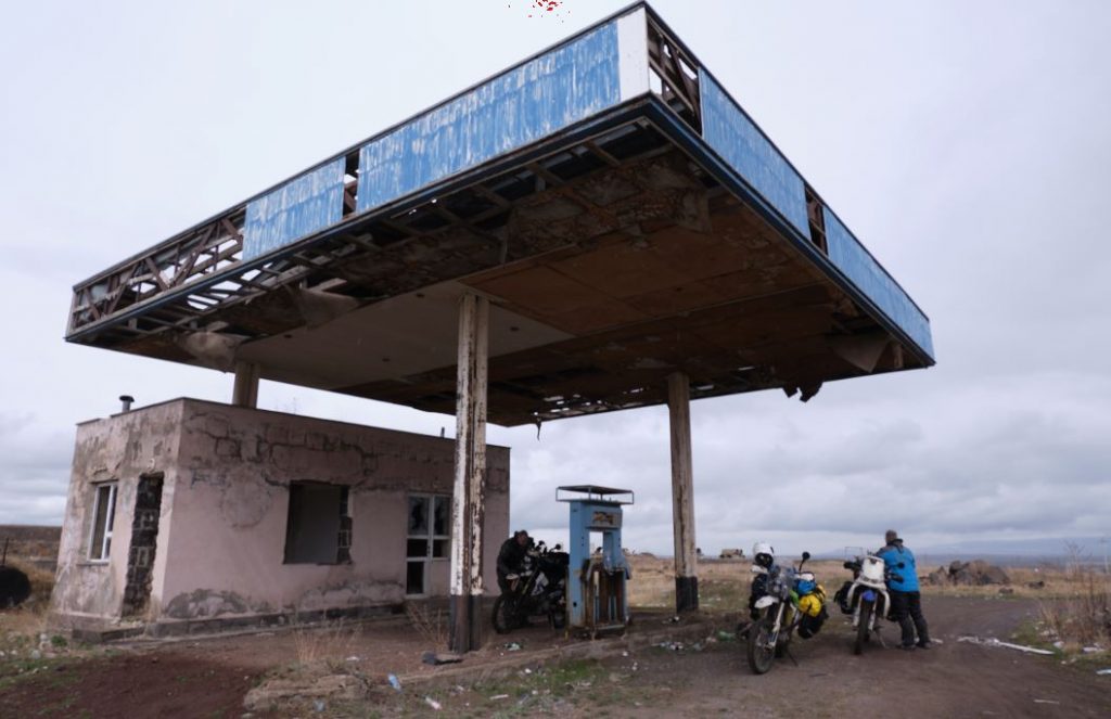 Dan houdt het comfort ook ineens weer op. Kuilen en laveren. Veel Russische invloed is hier zichtbaar. Deels ingestorte en in onbruik geraakte fabrieken ontsieren de omgeving. Wegwerkzaamheden zonder schijnbare activiteit. Langs een rivier rijdend lijkt het dal in het niets te eindigen. Langzaam kruipt de weg omhoog en naderen we de grens met Georgië. We tanken voor de laatste Armeense DRAM’s in de grensplaats en geven ons over aan de grillen van grenswachten. In tegenstelling tot de verwachting passeren we nu redelijk vlot de grenzen. Blijft een dingetje op de motor. Paspoort, rij- en kentekenbewijs moeten 4 keer opgediept worden. Grenspolitie en douane laten aan beide kanten hun ma ht gelden. Motor uit, helm af, handschoenen uit, papieren pakken en afgeven, wachten, wachten, papieren weer in ontvangst nemen en opbergen, helm op, handschoenen aan en even verder het riedeltje weer herhalen.